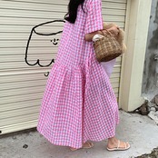 Free チェック柄 マキシ丈 半袖 ラウンドネック 綿 ポリエステル ガーリー カントリー ナチュラル カジュアル ママコーデ 20代 30代 40代 50代 cocomomo