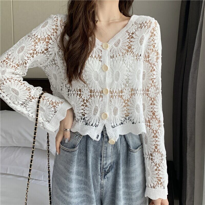クロップド透かし編み カーディガン フロントボタン 花柄Vネックカーディガン