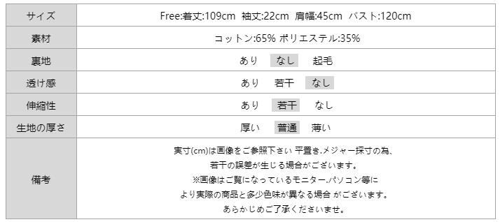 Free:着丈 109cm 袖丈 22cm 肩幅 45cm バスト 120cm