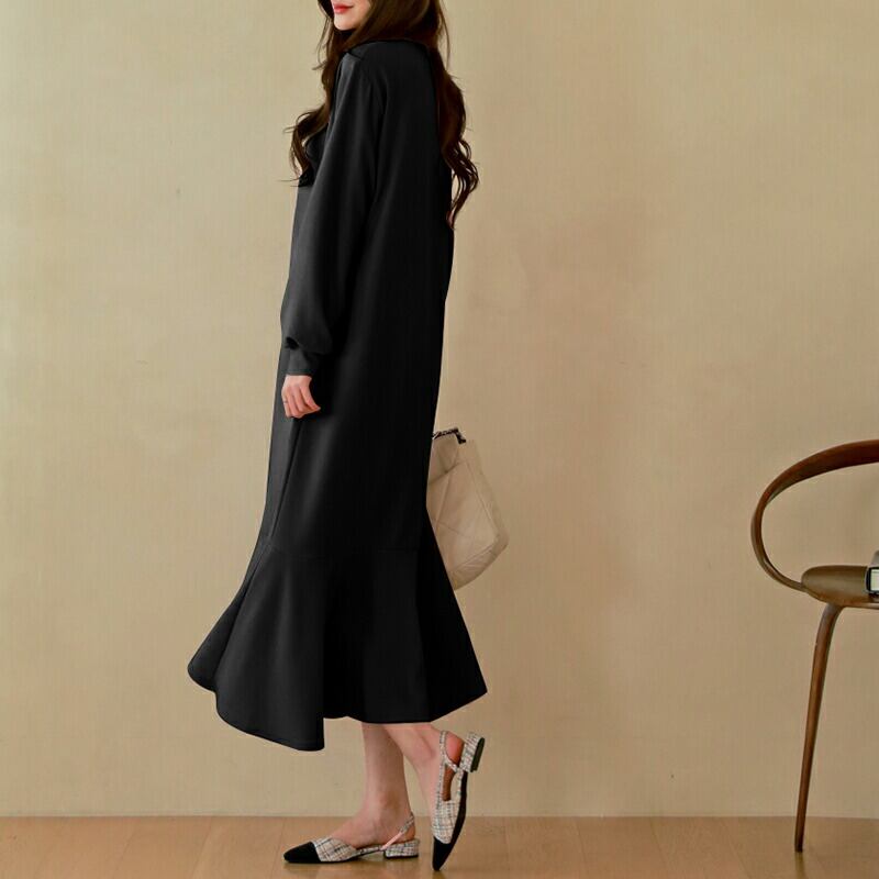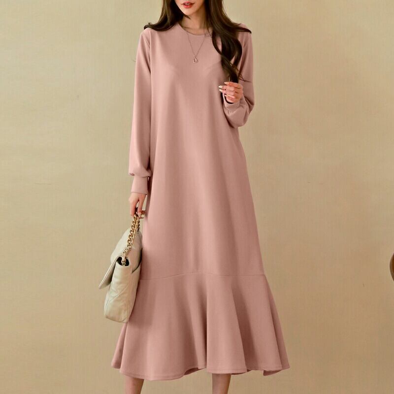 裾フレア 柔らかいクレープ生地 薄手スウェットワンピース フレアワンピース ロングワンピース ワンピース Uネック 長袖 ワンピース