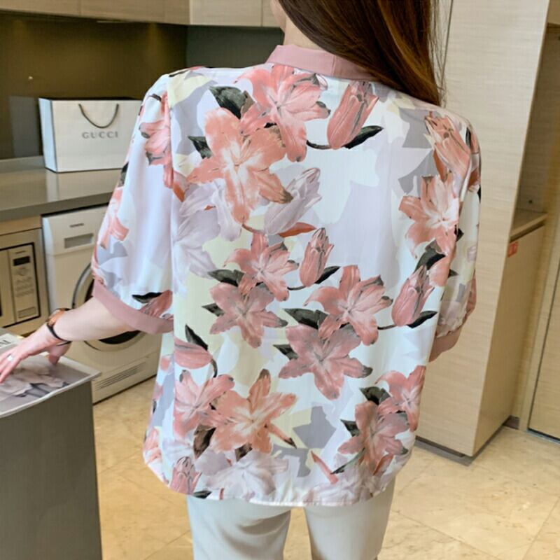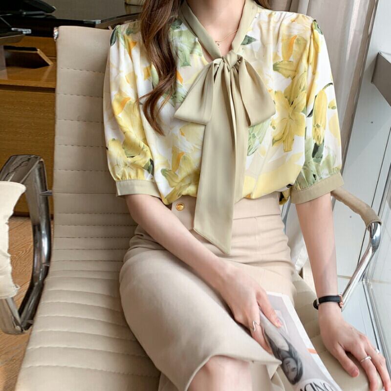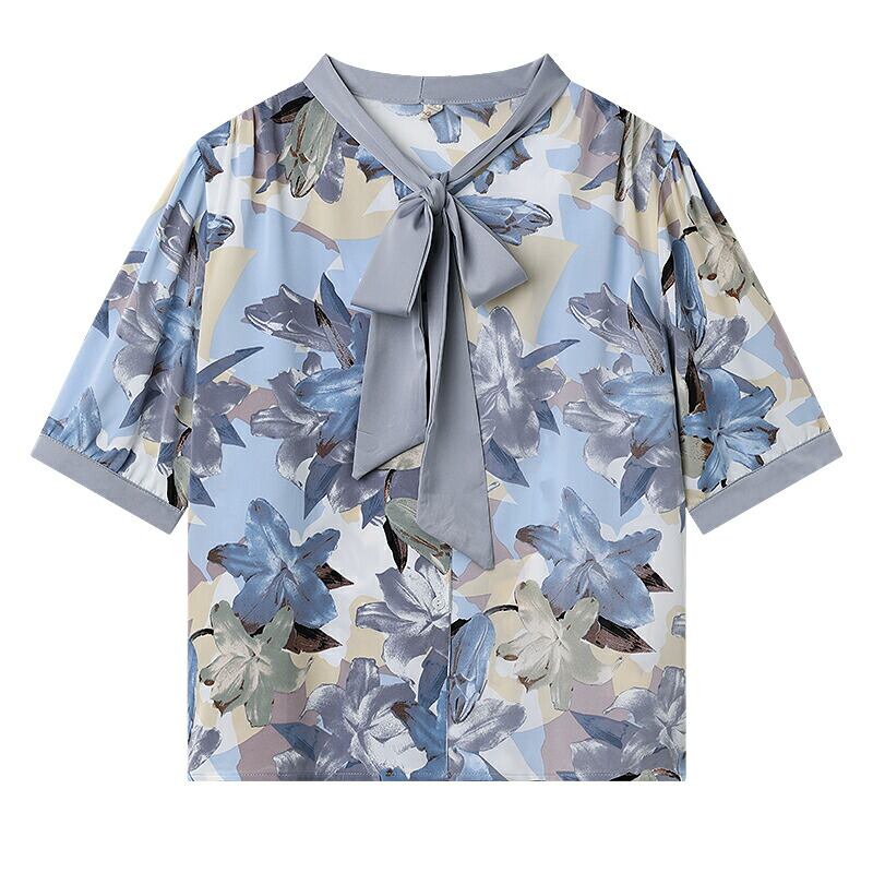ブラウス ボウタイ リボン 花柄 五分袖 リボンブラウス トップス レディース 半袖 フラワー レトロ 清楚 可愛い オフィス カジュアル おしゃれ フェミニン