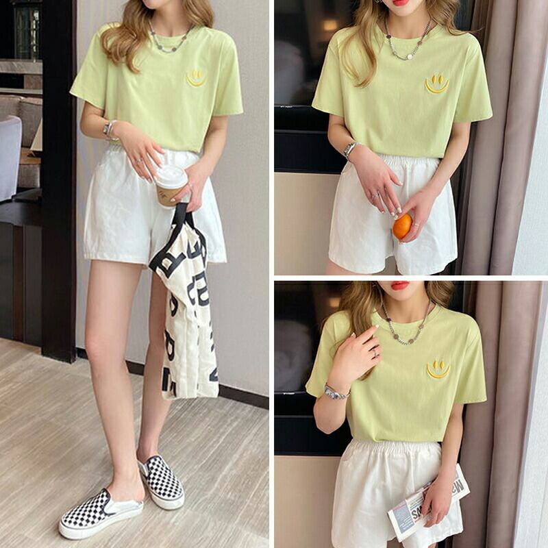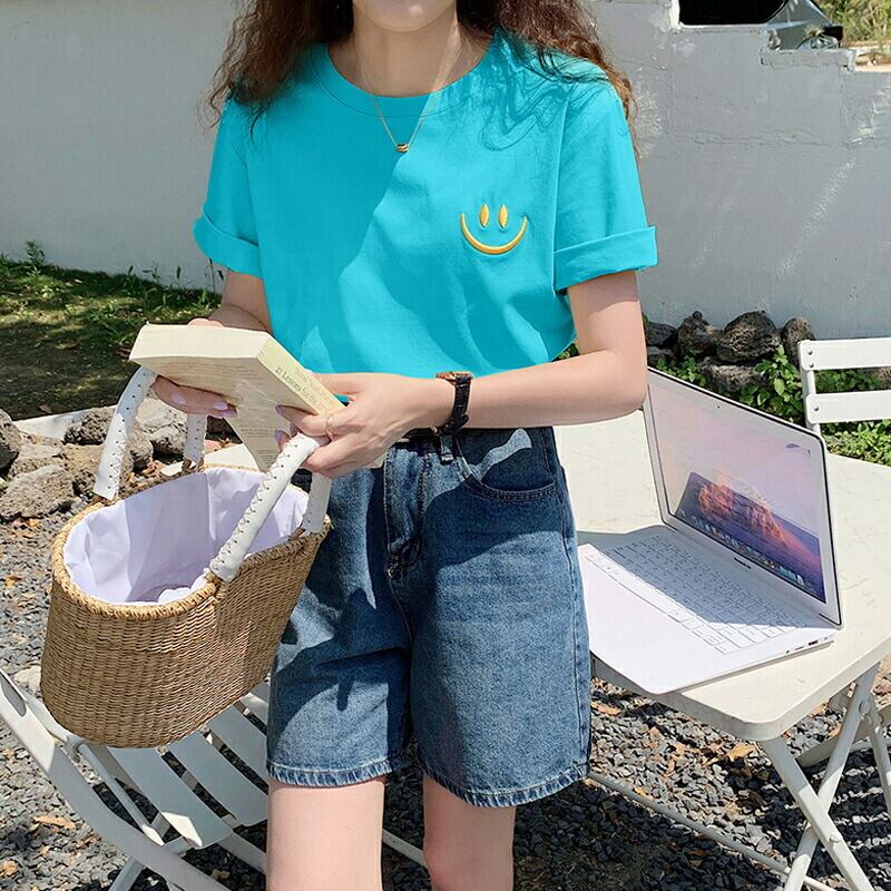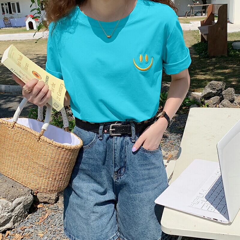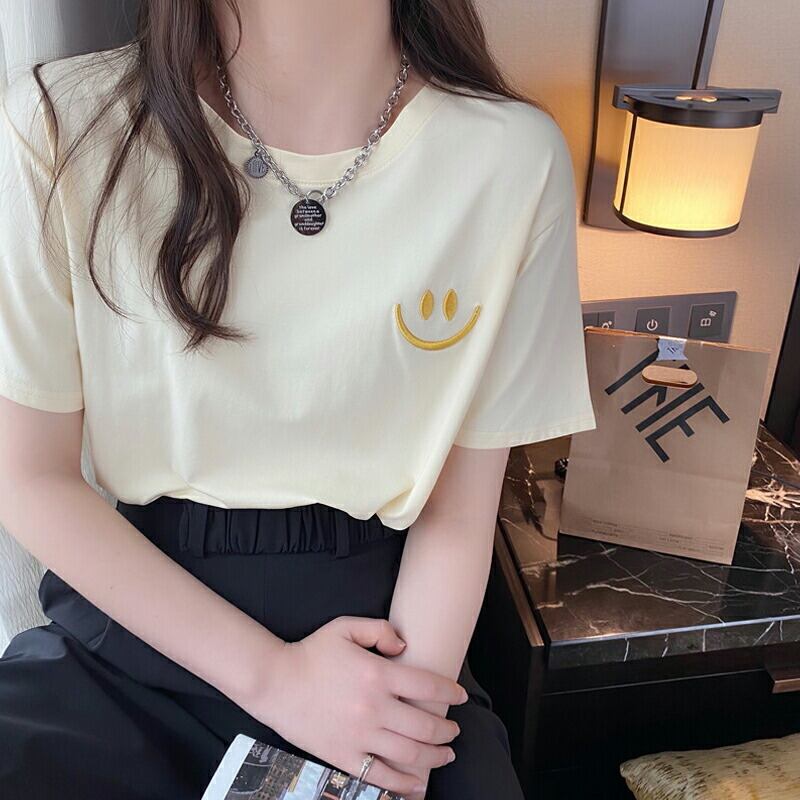 Tシャツ 半袖 スマイル刺繍 ワンポイント トップス 無地 トップス レディース カットソー シンプル カジュアル きれいめ フリーサイズ