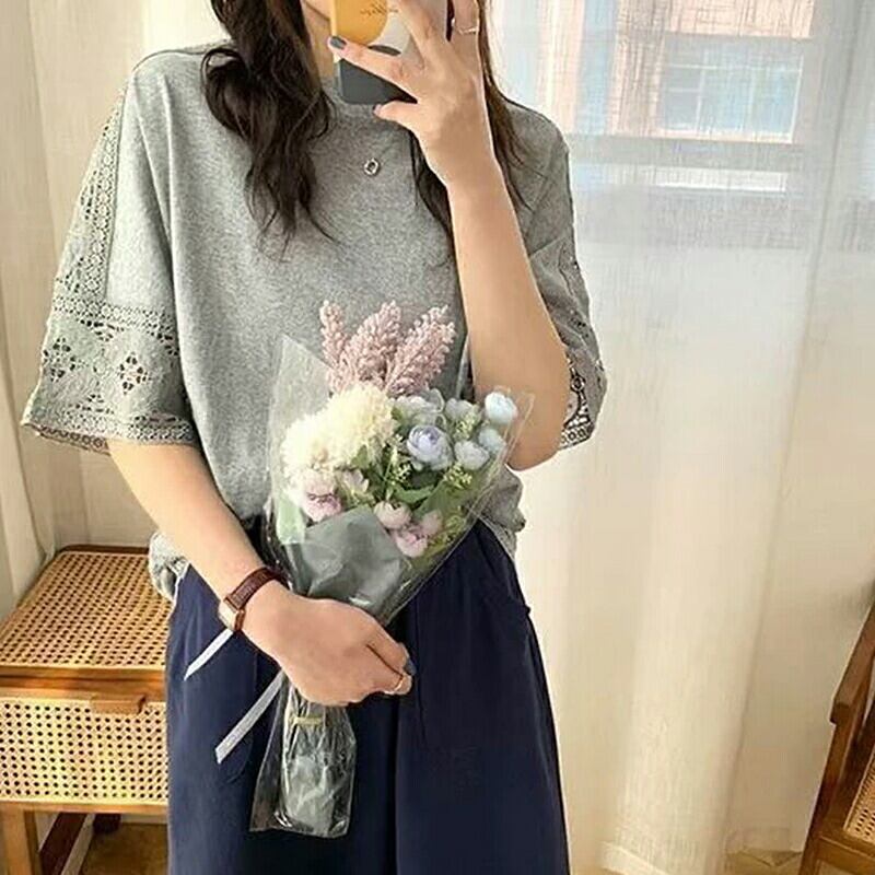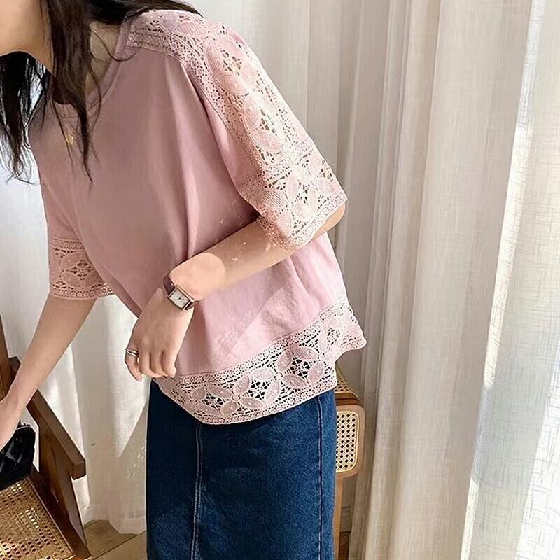 Tシャツ レース 五分袖 クルーネック トップス ミドル丈 リッチアイテム ブラウス 五分丈袖 土キング トップス レディース 透かし編み フェミニン 透け感