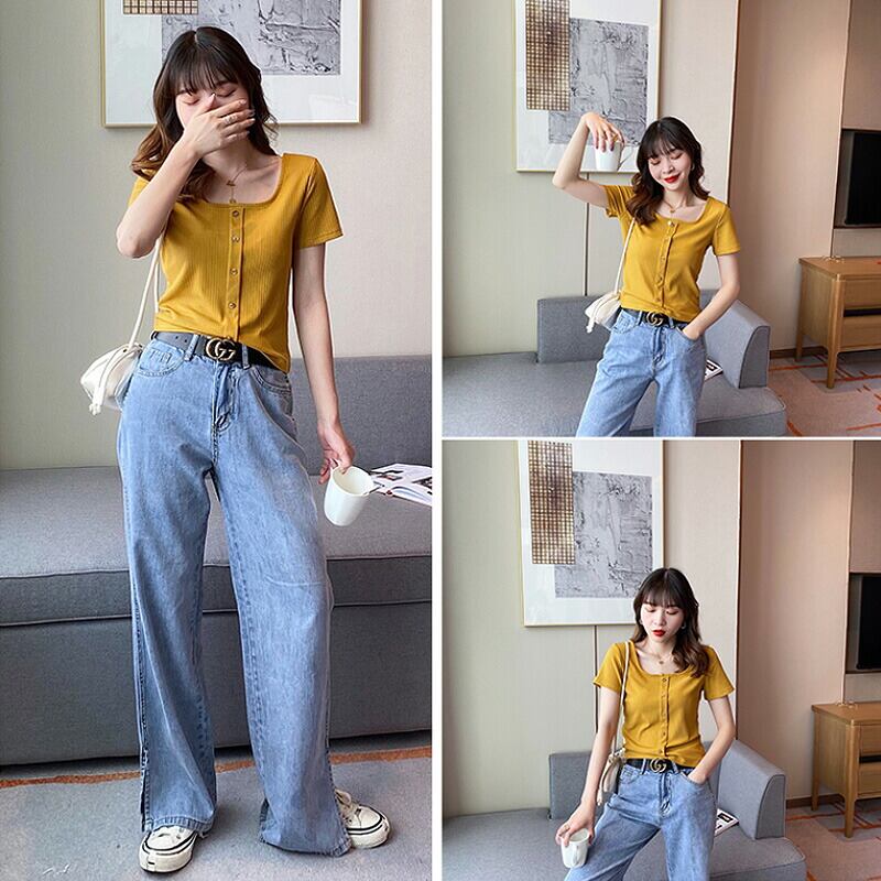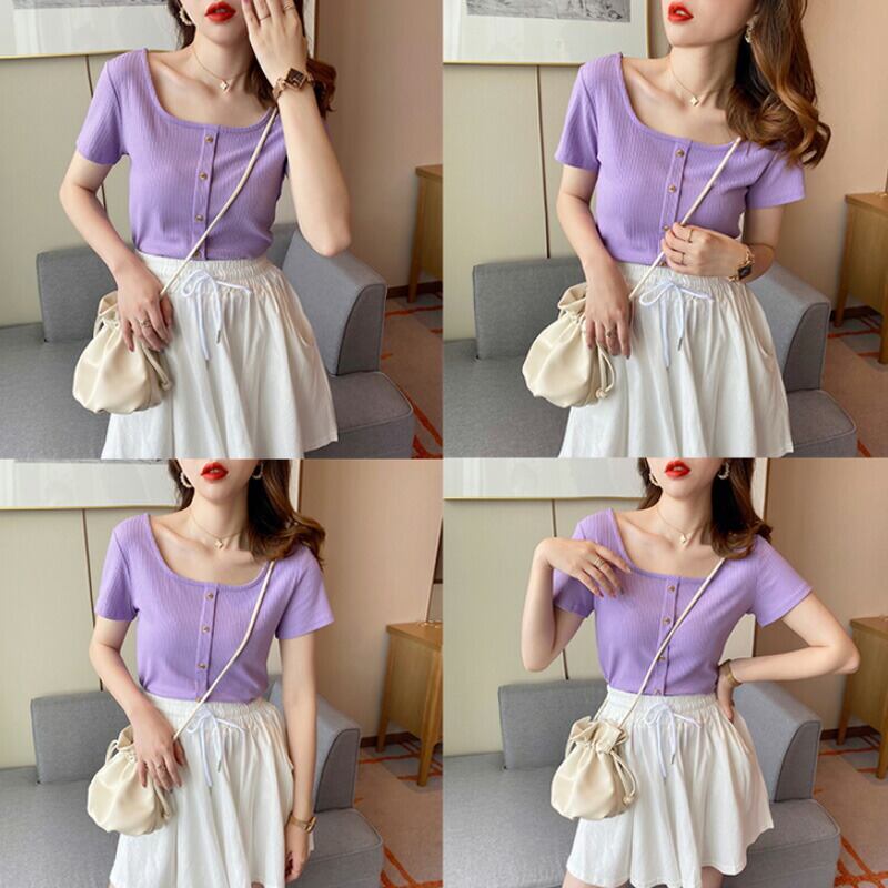リブTシャツ 薄手 Uネック クルーネック ショート丈 カットソー ボタン 夏ファッション 大人 おしゃれ 可愛い シンプル カジュアル 着回し 重ね着