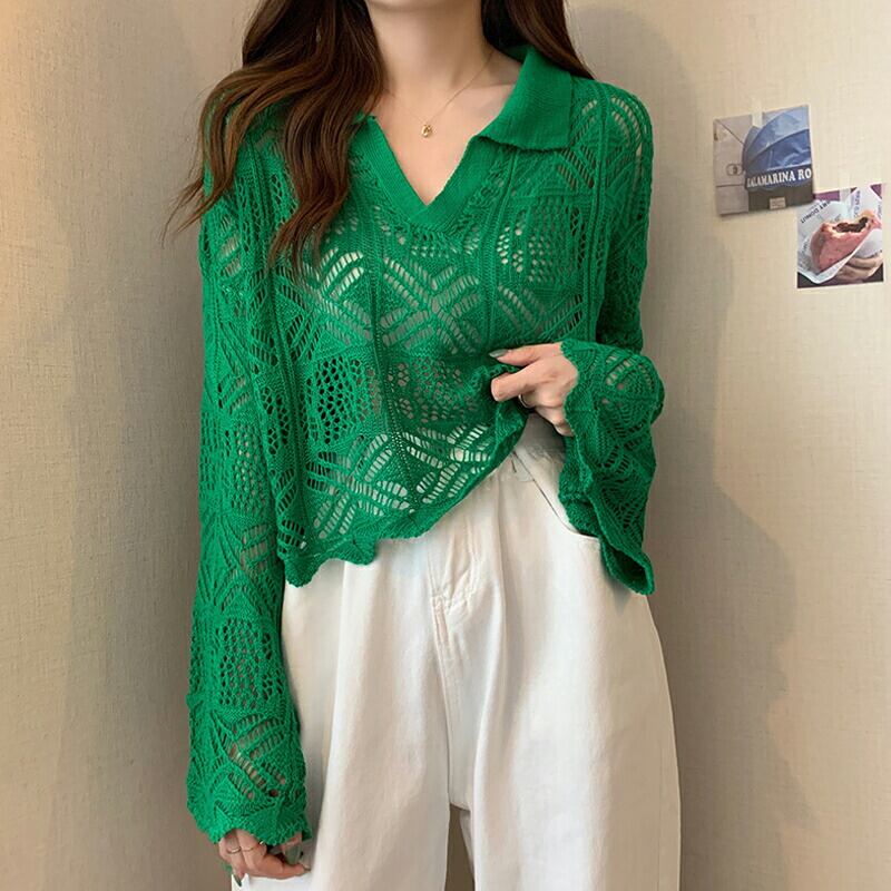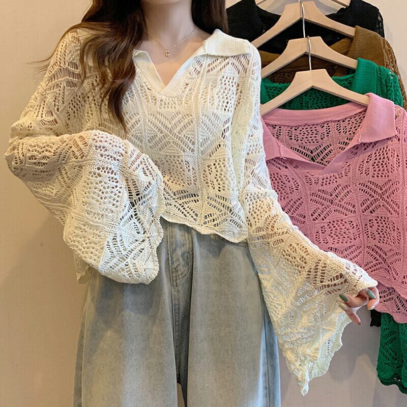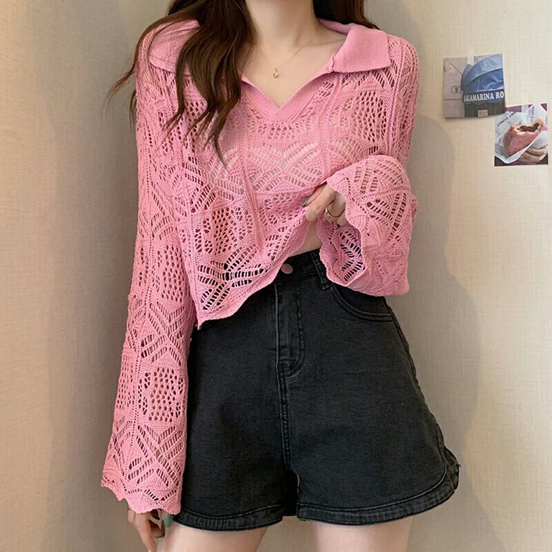サマーニット 透かし編みニットトップス かぎ編みニット ニット レディース ショート丈トップス 夏トップス 透かし編み かぎ編み 長袖 薄手 シアー フレア Vネック レース レトロ クロシェ 春服 夏服 秋服 春 夏 秋 韓国 韓国ファッション