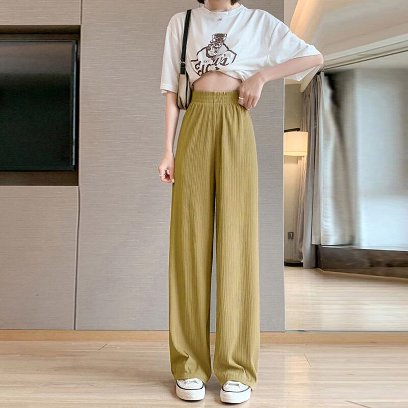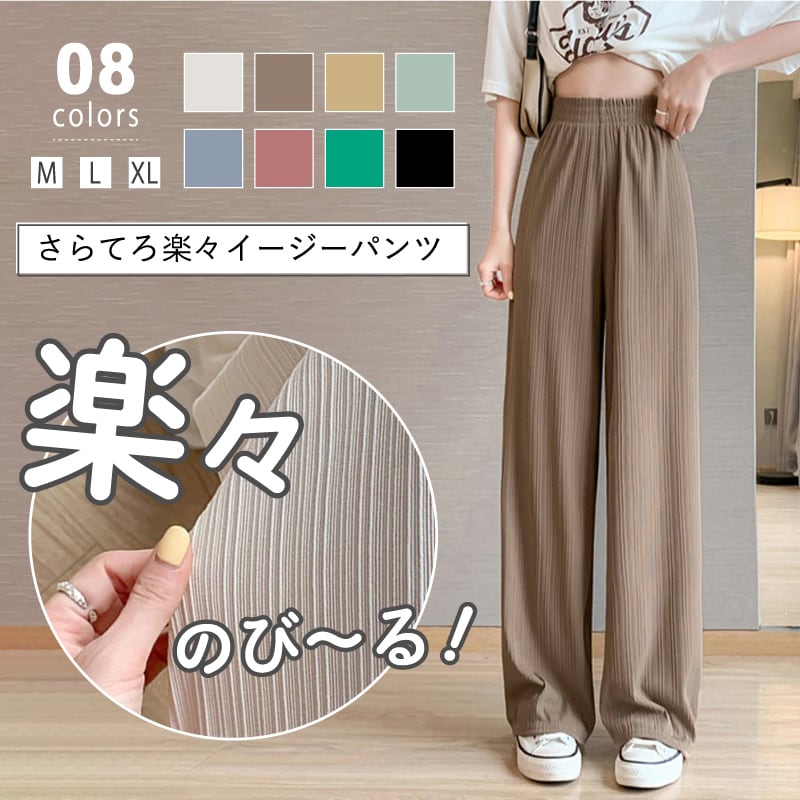 リブ ワイドリブ ストレートパンツ フレアパンツ ウエストゴム リラックスパンツ ゆったり 薄手 無地 ズボン 脚長 おしゃれ