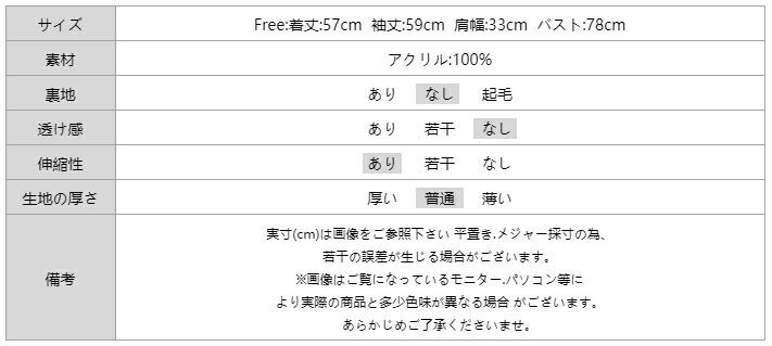 着丈 57cm 袖丈 59cm 肩幅 33cm バスト 78cm