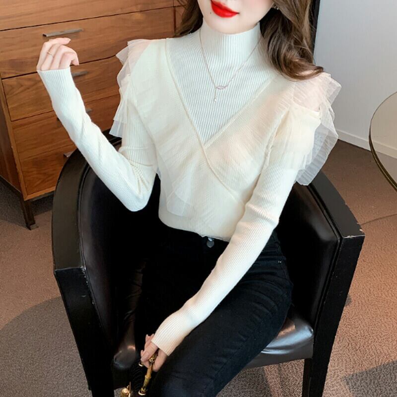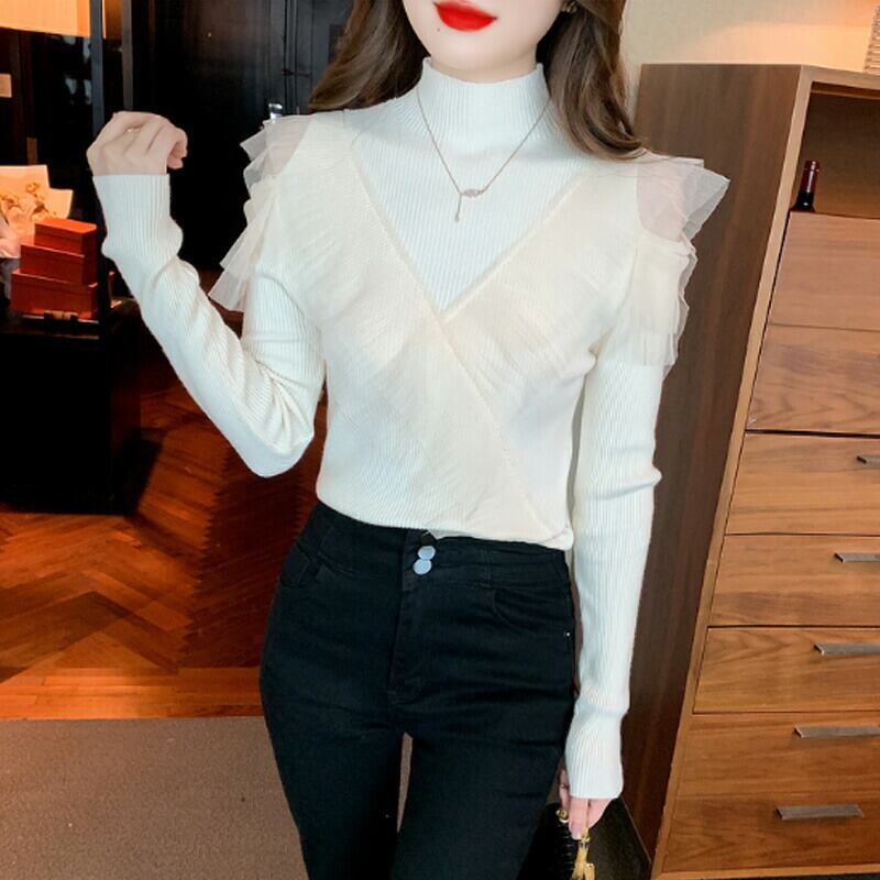 ハイネック プチハイネック シアーフリルハイネックニット レディース ニット リブニット フリル シアーフリル レース トップス 長袖 ハーフネック シアー セクシー オフィスカジュアル オフィス きれいめ 大人 春 秋 冬 秋冬 韓国 韓国ファッション | COCOMOMO select
