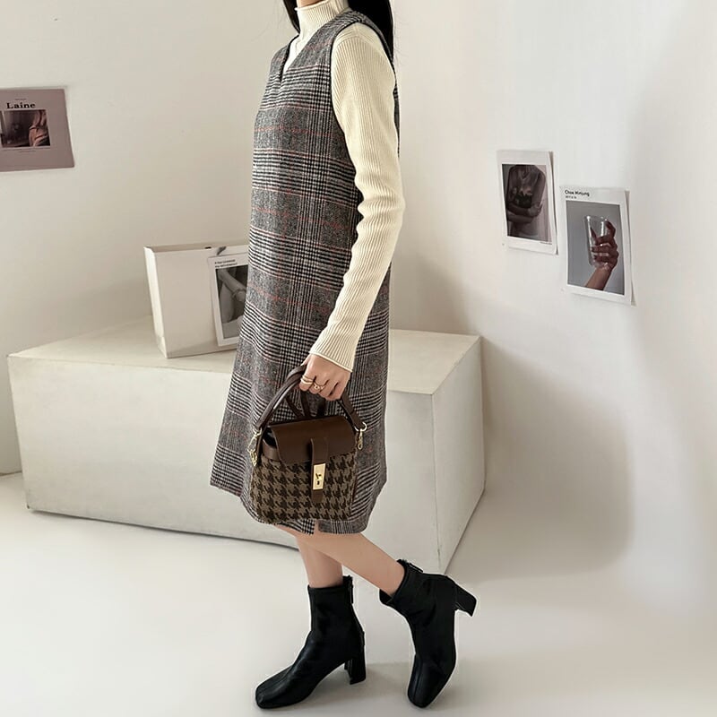 ジャンパースカート チェック柄ワンピース 選べる長さ ワンピース チェック スカート Vネック ロング ミディアム レディース ジャンスカ ノースリーブ 大きいサイズ オフィス オフィスカジュアル きれいめ 大人 秋冬 春 秋 冬 韓国 韓国ファッション | COCOMOMO select