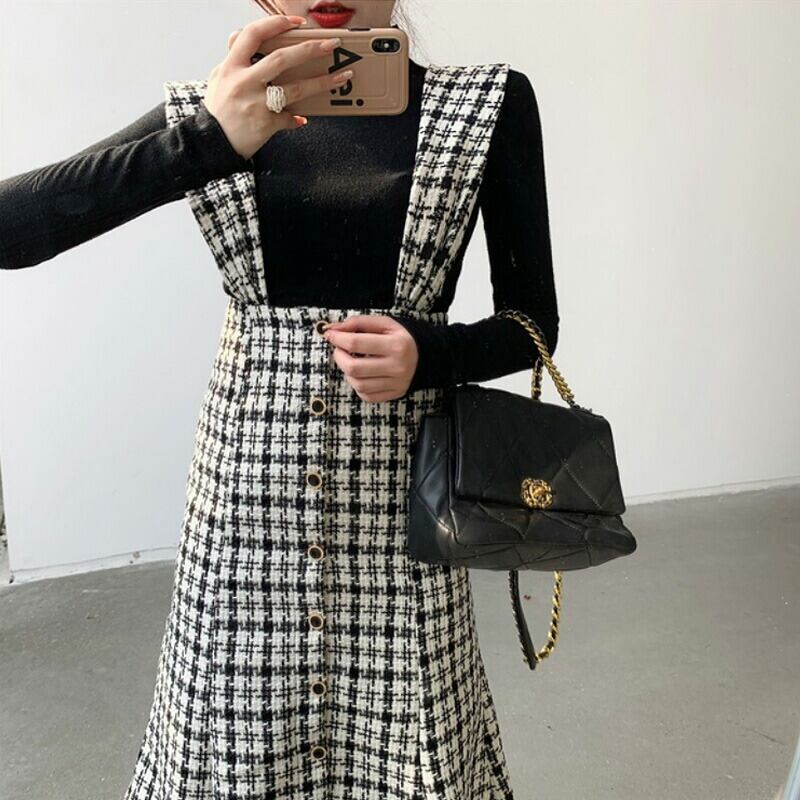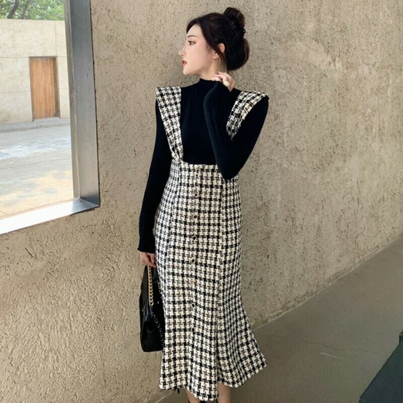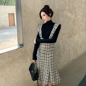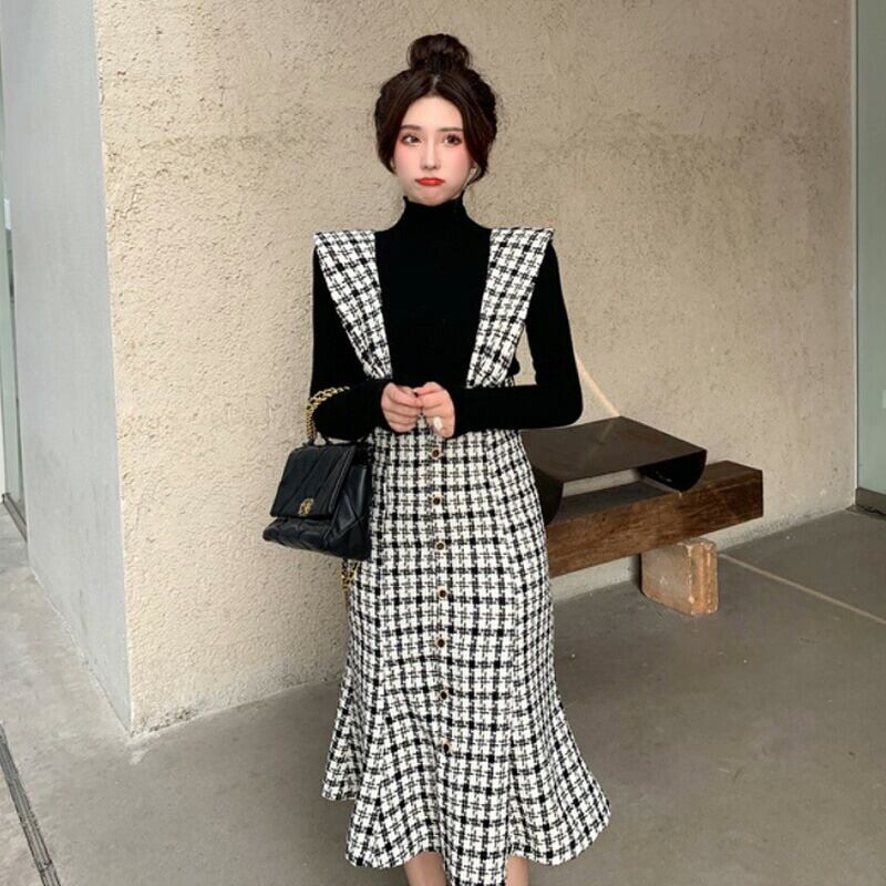 ジャンスカ チェック柄マーメイドジャンパースカート ワンピース ジャンパースカート ロング vネック ワンピ サロペット スカート マーメイドスカート ハイウエスト チェック柄 フレア ノースリーブ 大きいサイズ 秋冬 春 秋 冬 韓国 韓国ファッション