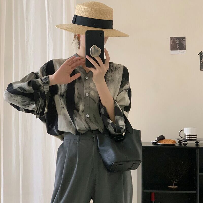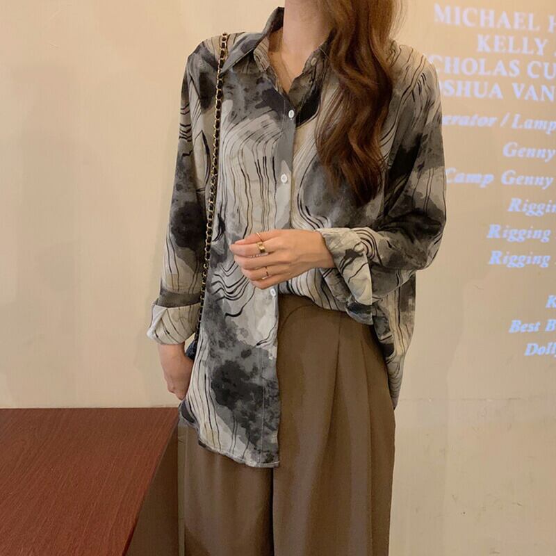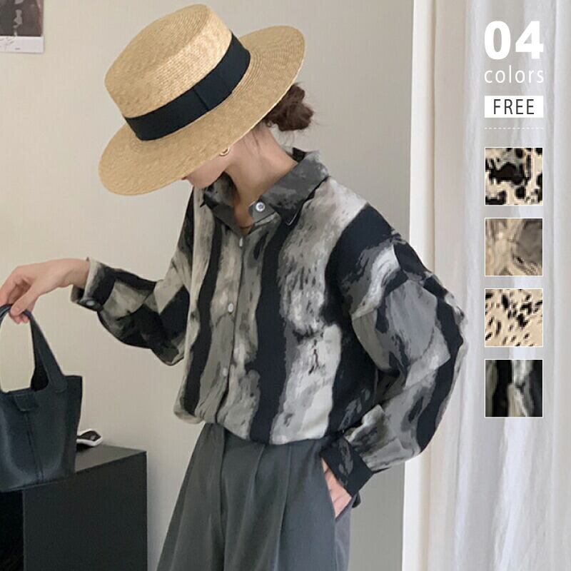 ブラウス 総柄デザインブラウス シフォンシャツブラウス レディース 長袖 シャツ トップス レトロ 柄 シフォン 前開き ゆったり 大きめ 大きいサイズ 薄手 オフィス オフィスカジュアル 大人 おしゃれ 春夏 春 夏 秋 韓国 韓国ファッション