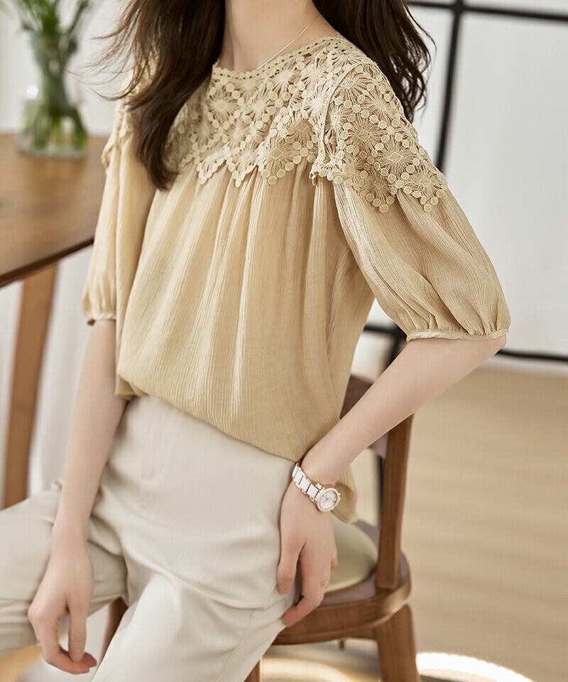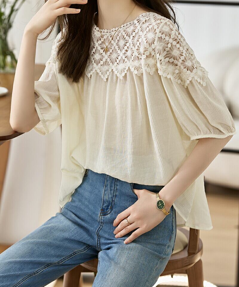 ブラウス 刺繍ブラウス フラワーレースブラウス レース レディース シアー トップス シアートップス シースルー 透け感 五分袖 ぽわん袖 フリル ゆったり 体型カバー オフィス オフィスカジュアル レトロ フェミニン 春 夏 韓国 韓国ファッション