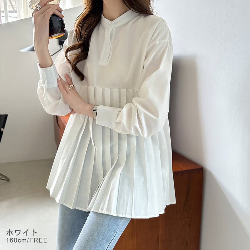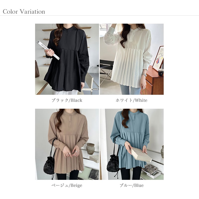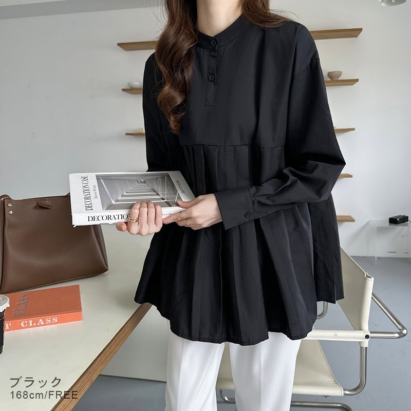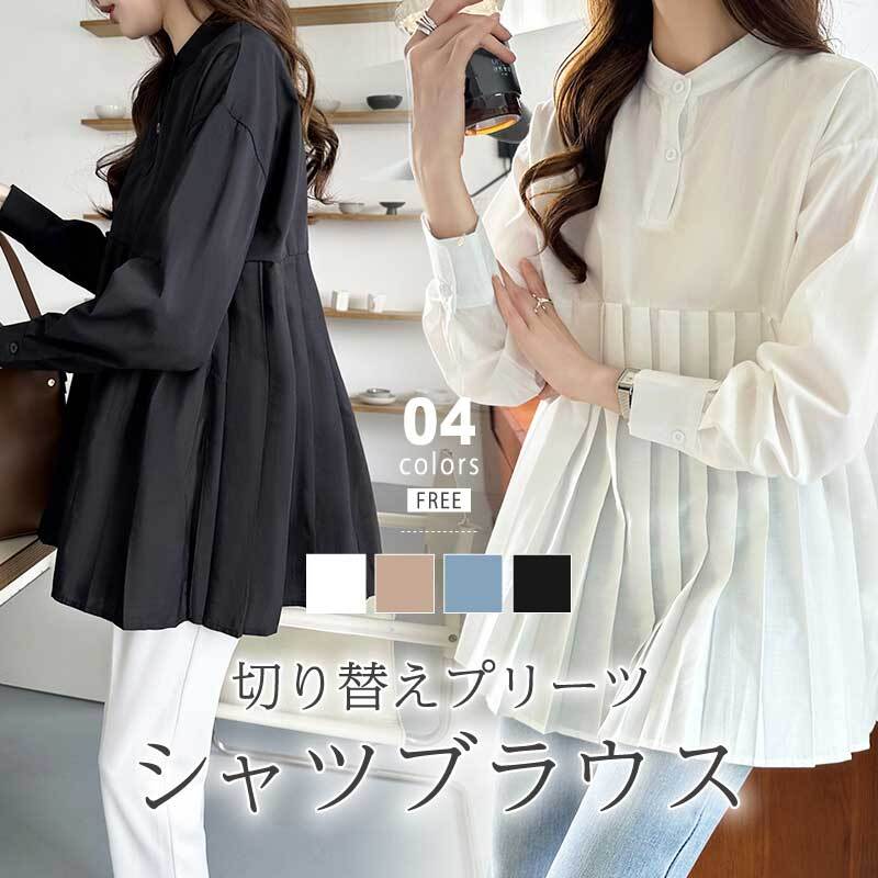 プリーツ切り替えブラウス チュニック 体型カバー レディース トップス 切り替え 長袖 ゆったり aライン ハイウエスト プリーツ バンドカラー シンプル シャツ オフィス オフィスカジュアル 着回し 大人 きれいめ 春 秋 冬 韓国 韓国ファッション | COCOMOMO select