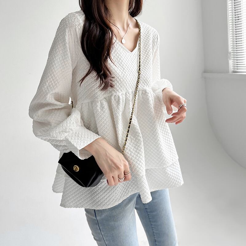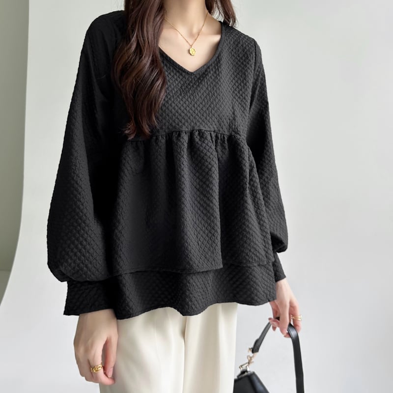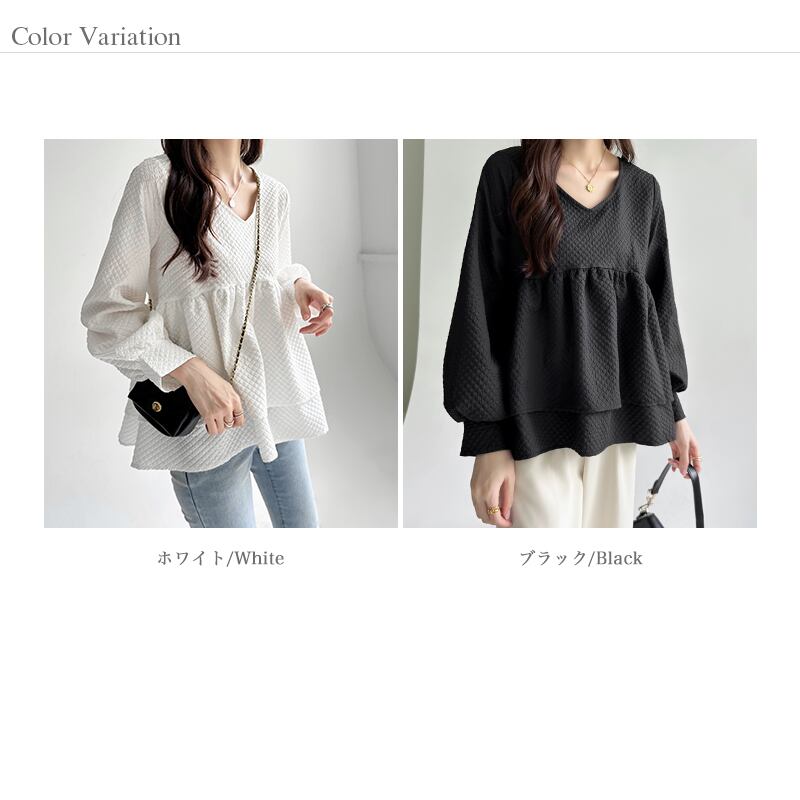 ティアードチュニックブラウス ふくれジャガード ペプラムブラウス ブラウス トップス チュニック ジャガード 長袖 レディース vネック バルーン シャツブラウス エンボス 体型カバー バルーン袖 オフィスカジュアル 春 秋 冬 韓国 韓国ファッション