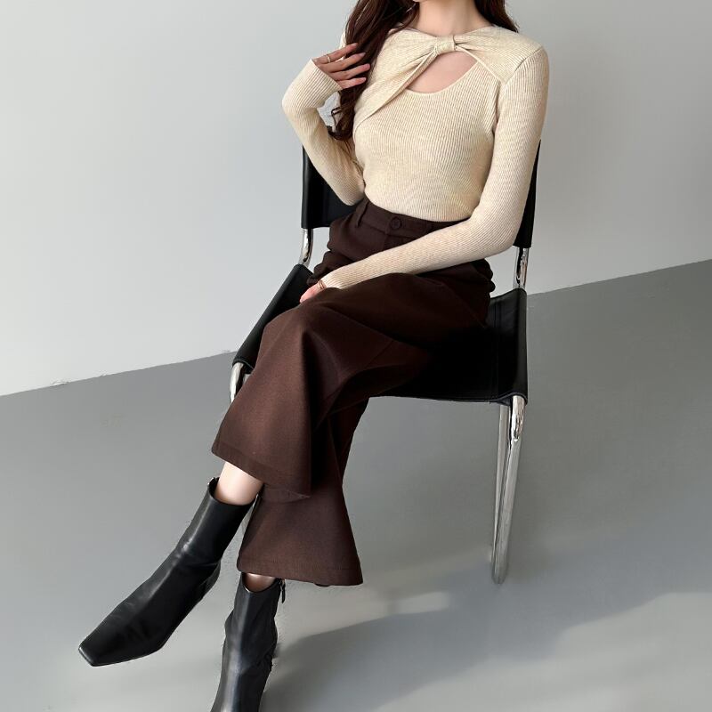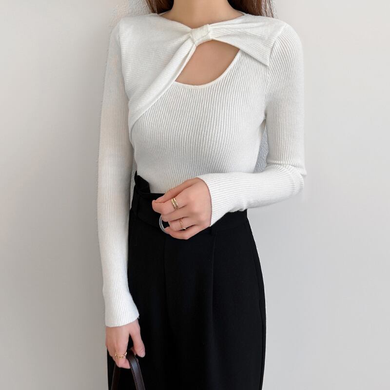 リボンニット カットアウト リブニット ニット リボン 長袖 トップス セーター レディース ニットセーター プルオーバー 肌見せ 胸元 肩リボン フィット オフィス オフィスカジュアル セクシー 大人 可愛い 秋冬 春 秋 冬 韓国 韓国ファッション