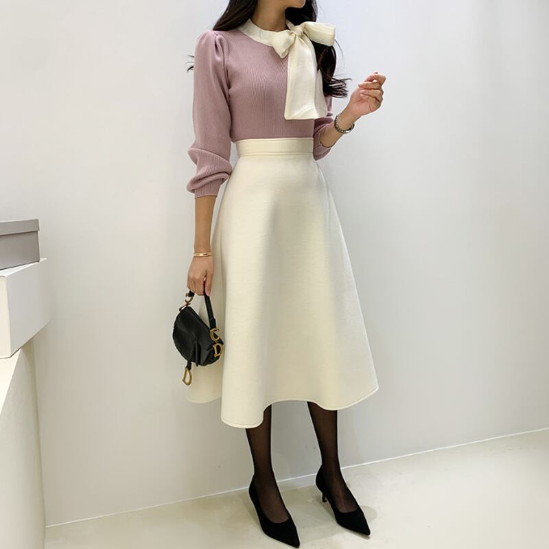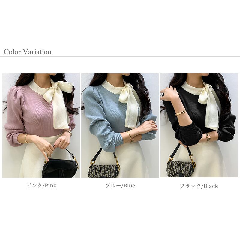 配色リボン パワショルニット りぼんニット ニット ボウタイ リボン 配色 パワショル トップス リブニット レディース リボンタイ セーター パフスリーブ 肩 長袖 暖かい オフィス オフィスカジュアル きれいめ 秋冬 秋 冬 韓国 韓国ファッション